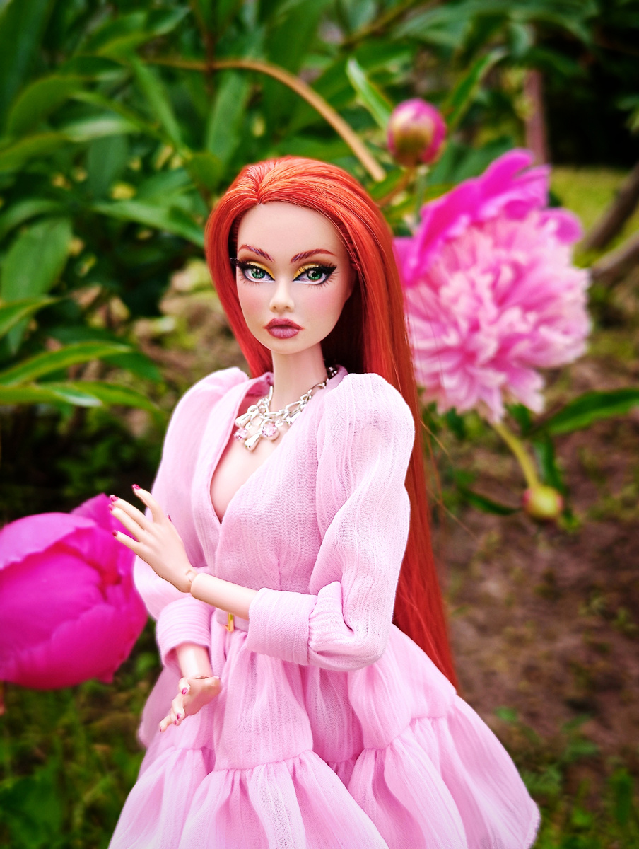 Я наконец-то дождалась цветения пионов, но погода не разделяла моей радости и готовности скорее бежать фотографировать кукол. Однако меня было уже не остановить, мне все же удалось успеть сделать несколько фотографий. Сегодня моей моделью стала Тейя. Это розовое платье также напоминает мне пион. Пионы — мои любимые цветы и самые долгожданные. Но, конечно, все цветы прекрасны. Получилось даже сделать небольшое видео, воспевающее нежность.