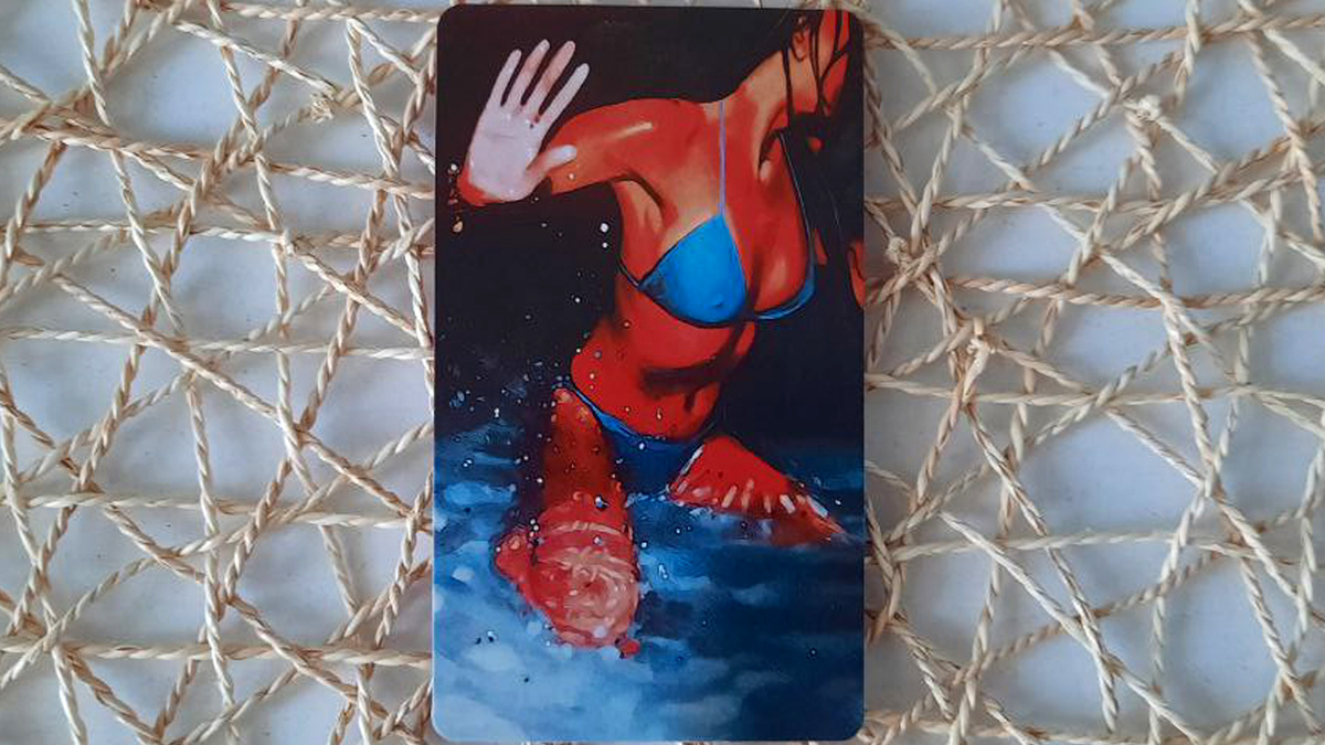 Девушка в синем купальнике, сидящая в воде на чёрном фоне, отворачивается от зрителя и вытягивает руку с раскрытой ладонью. В этом образе сочетаются притяжение и отстранённость, открытость и защита, желание и нежелание быть увиденной.