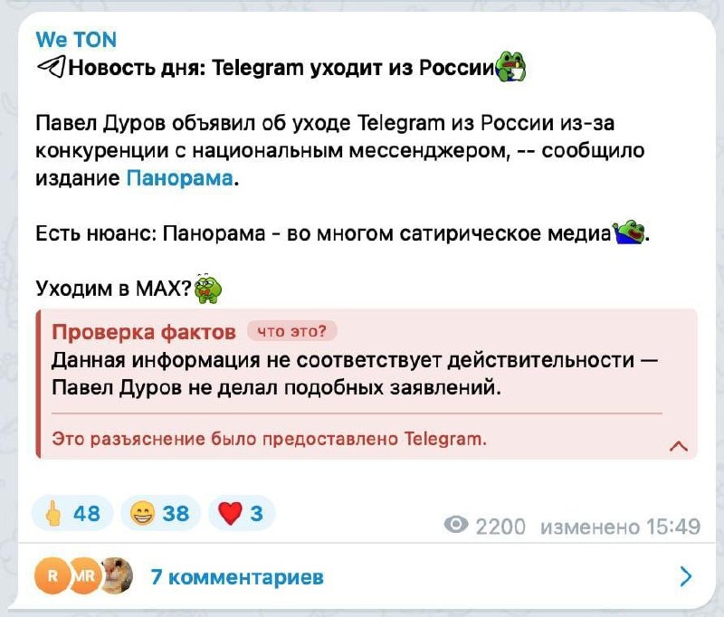 В Telegram появились плашки «Проверка фактов» — первыми под раздачу попали шутники из канала We TON: под их постом об «уходе Telegram из