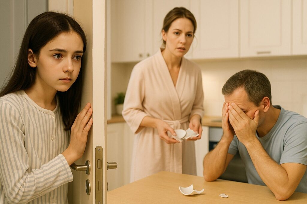 Лена на цыпочках подкралась к двери. В щель было видно, как мама стоит спиной к папе, сжимая в руках осколки разбитой чашки. Папа сидел за столом, уткнувшись лицом в ладони.