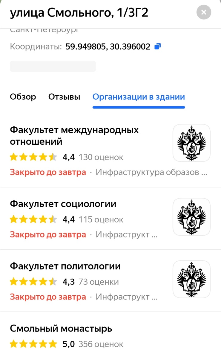 В Смольном монастыре находится неосновная площадка университета. Только несколько факультетов.