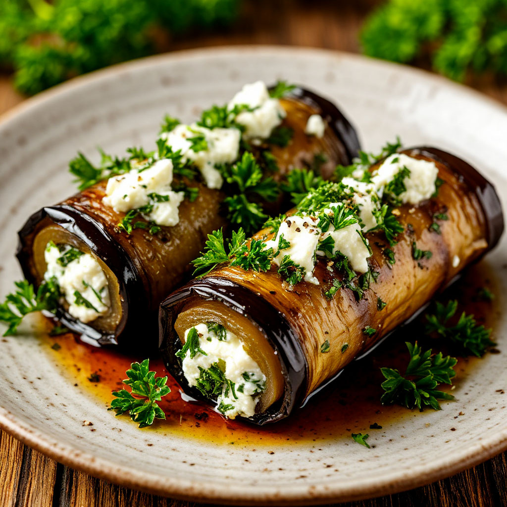 **Ингредиенты:** * Баклажаны — 2 шт * Творожный сыр — 150 г * Твердый сыр — 50 г * Чеснок — 3 зубчика * Зелень свежая (петрушка, укроп) — по вкусу * Оливковое масло — для смазывания * Соль, черный перец — по вкусу **Приготовление:** **Шаг 1. Подготовка баклажанов** * Тщательно промойте баклажаны и удалите хвостики * Нарежьте вдоль тонкими ломтиками (0,5 см) * Посолите ломтики и оставьте на 10 минут * Смажьте оливковым маслом с обеих сторон **Шаг 2. Запекание** * Выложите ломтики на пергамент * Запекайте при 200°C около 15 минут до мягкости * Остудите готовые ломтики **Шаг 3. Приготовление начинки** * Мелко нарежьте зелень * Измельчите чеснок * Смешайте творожный сыр с зеленью и чесноком * Добавьте соль и перец по вкусу **Шаг 4. Формирование рулетиков** * На каждый ломтик баклажана выложите начинку * Аккуратно сверните в рулетик * Выложите в форму для запекания **Шаг 5. Завершающий этап** * Посыпьте тертым твердым сыром * Запекайте при 180°C 10-15 минут * Подавайте горячими, укр