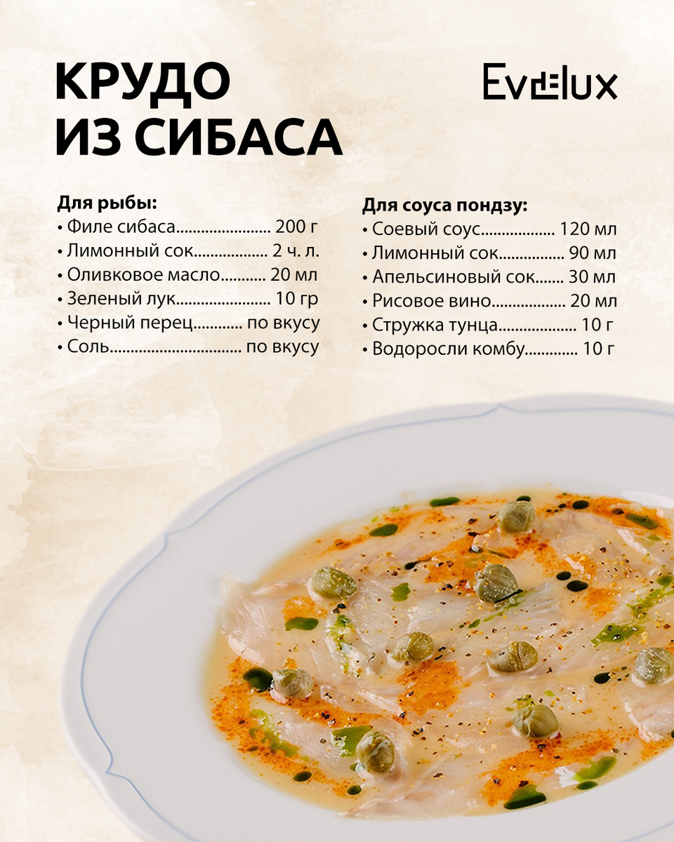 Когда хочется насладиться нежностью свежей рыбы с азиатскими нотками, рекомендуем попробовать крудо из сибаса под соусом пондзу. Нежное филе сибаса, нарезанное тонкими слайсами, имеет деликатный морской вкус с легкой сладостью. А соус пондзу придает блюду цитрусовые ноты с легкой кислинкой и пикантностью. Чтобы приготовить крудо, вам понадобится холодильник. Рекомендуем обратить внимание на модель Evelux FS 2291 DX. Этот холодильник оснащен режимом «Отпуск», который позволит вам не беспокоиться о продуктах во время вашего длительного отсутствия. Приобрести его вы сможете на нашем официальном сайте по ссылке: https://clck.ru/3AUgA3