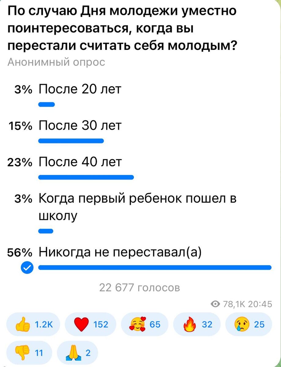 ⚡️⚡️⚡️ 56 процентов проголосовавших никогда и не переставали считать себя молодыми. Главное, ребята, сердцем не стареть.