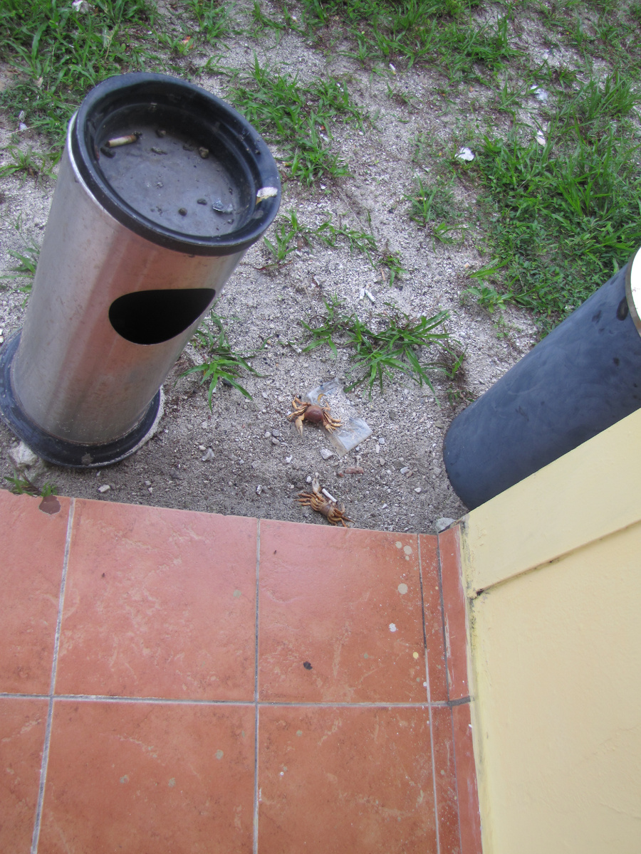 В принципе экскурсия на Кайо Ларго не предполагает долгого пребывания именно на этом острове. Прилетаешь в аэропорт, пересаживаешься в автобус. Автобус везет тебя куда-то на большой пирс. Там необходимо пересесть на лодку и плыть дальше по морю, к основным достопримечательностям и интересностям. Отели на острове есть, но как сказал гид, почти все места там выкупают французские и канадские тур. фирмы под своих клиентов. Поэтому пожить там в принципе можно, но иногда достаточно проблематично найти не забронированное место. Нас это не волновало, так как ночевать на Кайо Ларго мы не собирались. Первое, что бросилось в глаза по выходу из здания аэропорта — мы снова в тропиках. Дохлые крабы возле пепельницы. Следующим местом, обязательным для посещения на экскурсии, был питомник морских черепах — Маринаc Тортугаc. Тут я конечно опять вспомнил Пиратов Карибского моря. Тортуга, пиратская база в Карибском море, переводится с испанского как "черепаха" и точно звучит как Isla de Tortuga. Тут сдел