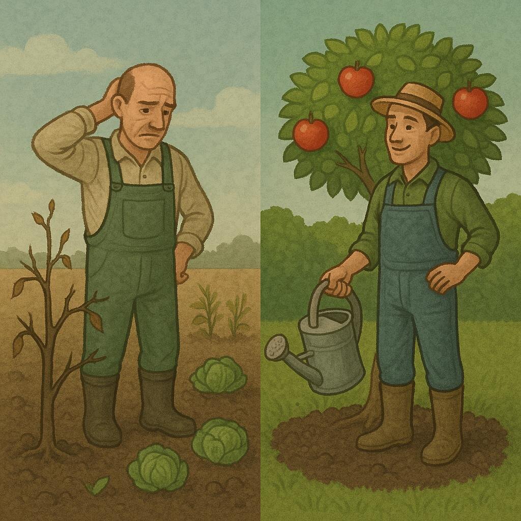Притча о двух садовниках 🌱 Два садовника получили одинаковые участки. Первый: "Посажу всё сразу — яблони, розы, овощи!" Второй: "Начну с одного семечка." Первый закупил саженцы на все деньги, посадил везде. Не хватило времени ухаживать. К осени большинство погибло. Второй посадил одно семечко. Поливал каждый день. К осени — крепкое дерево. Следующий год: первый снова купил саженцы, снова не справился. Второй взял семена со своего дерева, посадил ещё три. Все прижились. Через пять лет: у второго — цветущий сад. У первого — пустырь. --- 💭 Мораль: Лучше вырастить одно крепкое дерево, чем засадить весь участок и не справиться. В служении важна не масштабность замысла, а постоянство ухода. --- "Дуб растёт медленно, но стоит века. Сорняк растёт быстро, но живёт день." А ты садовник грандиозных планов или терпеливый растениевод? 🌳