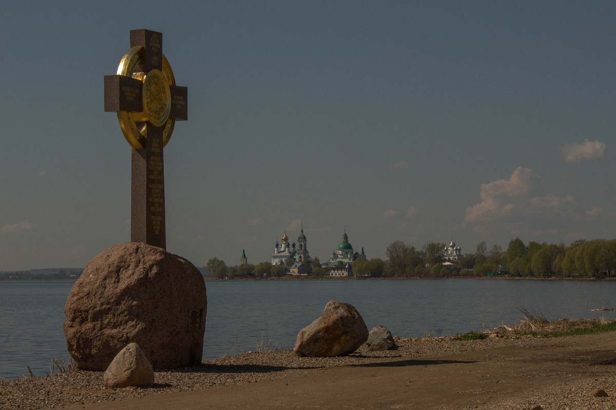 Памятник на берегу озеро Неро. Вид на Яковлевский монастырь.