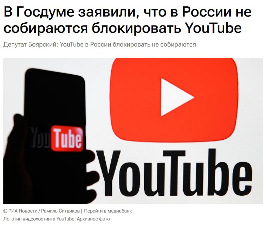 YouTube в России не собираются блокировать — глава комитета Госдумы по информполитике Сергей Боярский.