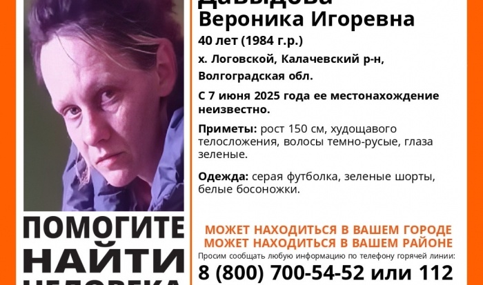 О местонахождении Вероники Давыдовой ничего не известно с 7 июня. В Калачевском районе Волгоградской области ищут пропавшую Веронику Давыдову 1984 года рождения. Женщина ушла из дома в х. Логовском 7 июня, с тех пор ее местонахождение неизвестно. Согласно приметам, указанным ПСО «ЛизаАлерт», рост пропавшей составляет 150 см, у нее худощавое телосложение, темно-русые волосы и зеленые глаза. В день исчезновения она была одета в серую футболку, зеленые шорты и белые босоножки. Всех, кто знает что-либо о местонахождении Вероники Давыдовой, просят позвонить по телефону: 8 (800) 700-54-52 или 112.