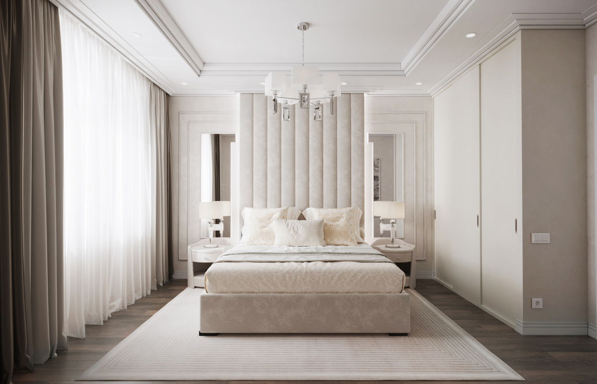 В просторных спальнях уместны крупные светильники, высокие изголовья, акцентные стены. Такие элементы работают на объём, но не утяжеляют интерьер. Светлая гамма остаётся основой, а детали задают характер.