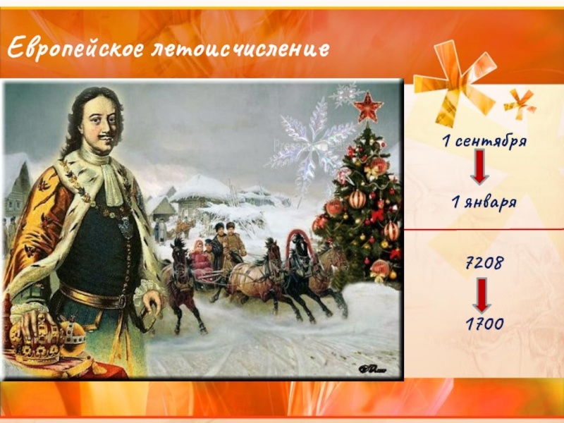 Царь Пётр принял царство с тяжёлым наследием. Приходилось выплачивать ежегодную дань Крымскому хану, правопреемнику Золотой орды, наследнику Монголо-татарского ига на Руси. Однако, Азовские походы Петра сняли это позорное пятно, выплата дани была прекращена. Чтобы перевернуть “ветхозаветную” страницу русской истории, царь Пётр решил ввести другое “новозаветное” летоисчисление от Рождества Христова, принятое повсеместно во всей Европе.