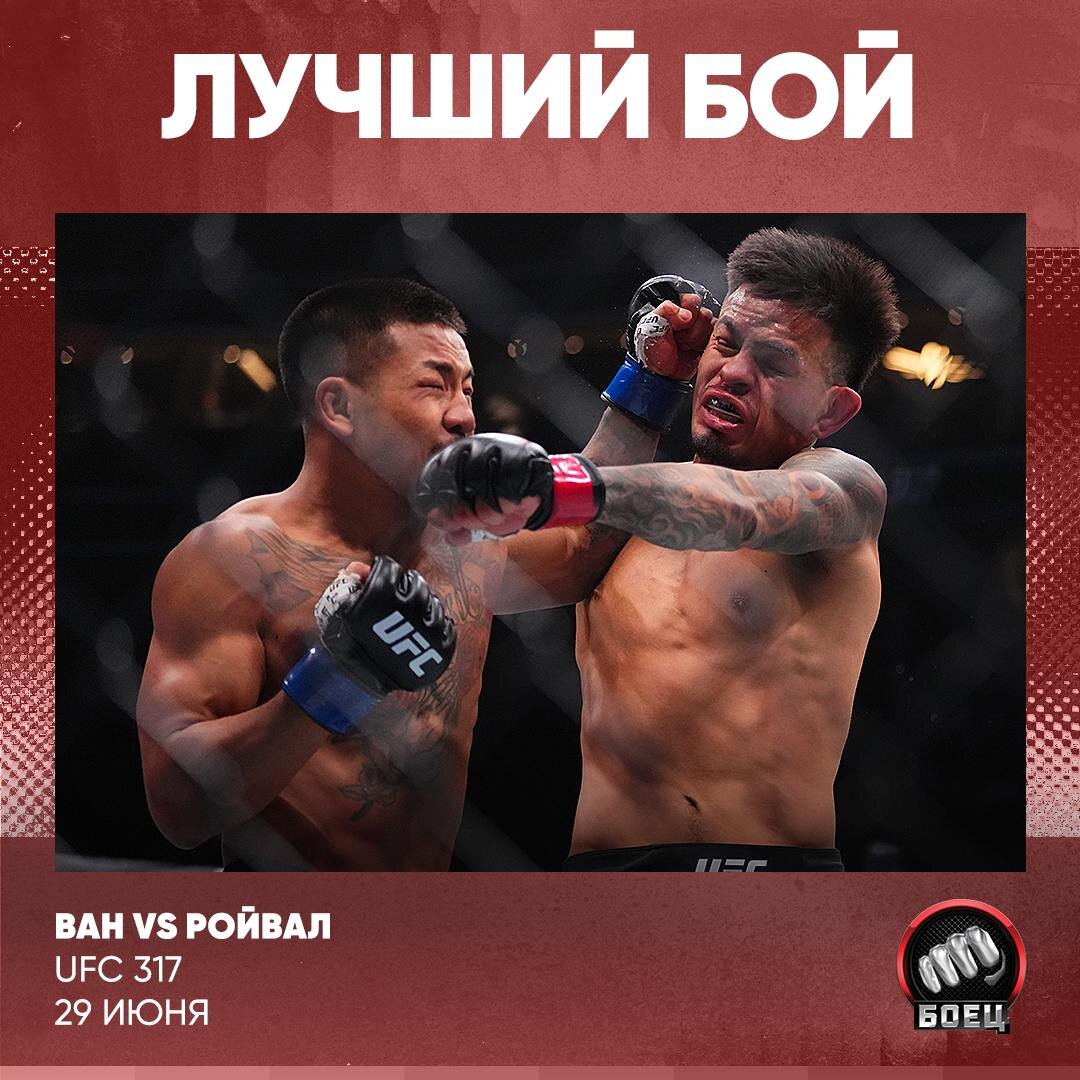 ЧТО. ЭТО. БЫЛО?! UFC 317 – 🤯🔥 Лучший бой по версии наших подписчиков забирают мухачи – Ван и Ройвал. Тут не поспоришь 🤩 Лучший финиш у Топурии. Здесь слова будут лишними. Это чемпионское и легендарное выступление 🙌 Оценка – ⭐️⭐️⭐️⭐️⭐️ Зафиксировали.