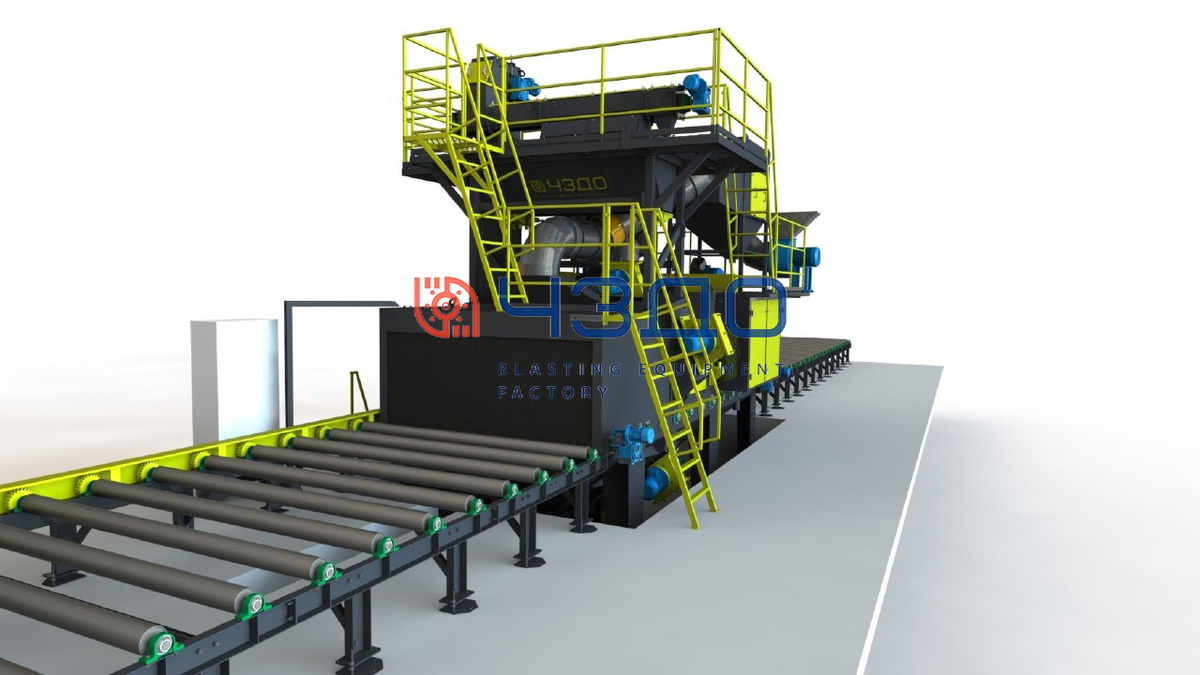 Дробемётная установка проходного типа с конвейером, предназначена для обработки наружной поверхности труб диаметром от 200 до 1420мм. Непрерывная очистка поверхности труб, круглых профилей и других изделий цилиндрической формы различного типа абразивными материалами от загрязнений, ржавчины и окалины. Облегчение и ускорение процесса резки и сварки стальных заготовок с очищенной поверхностью. Многократное увеличение срока службы защитных покрытий поверхности (например, краски, эмалей). Улучшение структуры поверхности обрабатываемых заготовок. Обрабатываемые заготовки движутся через установку по коническому роликовому конвейеру или по конвейеру с наклонно поставленными роликами.