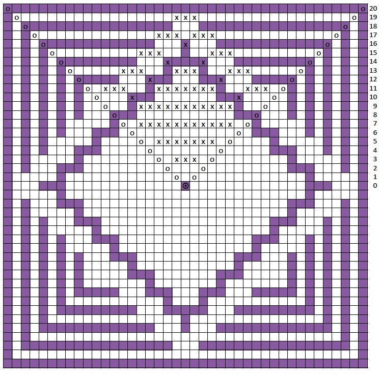 Время от времени просматриваю свои старые схемы, чаще всего с целью не повториться в дальнейших работах с узором. Но бывает и наоборот, что в старых схемах наталкиваюсь на новые идеи и воплощаю их в других работах. Так вышло и на этот раз: вдохновилась своей старой схемой для мотива «Амулет», даже задумалась: почему в прошлый раз, когда рисовала схему до этого не додумалась, ведь новые схемы получились на мой взгляд поинтересней. В этих схемах дала волю фантазии, использовала все три вида техник мозаичного вязания крючком. Ведь часто, именно сочетание в одной схеме сразу нескольких техник, не меняя при этом самого узора даёт порой непредвиденные результаты. В первых пяти схемах применила классическую технику в паре с «гобеленовой». В остальных схемах добавила в разных пропорциях «вафельную» технику. Общую схему сделала только для шестой и девятой схемы, поскольку угловые узоры во всех схемах одинаковые, мои любимые «полосатики». По размеру схемы небольшие, всего на двадцать рядов, в