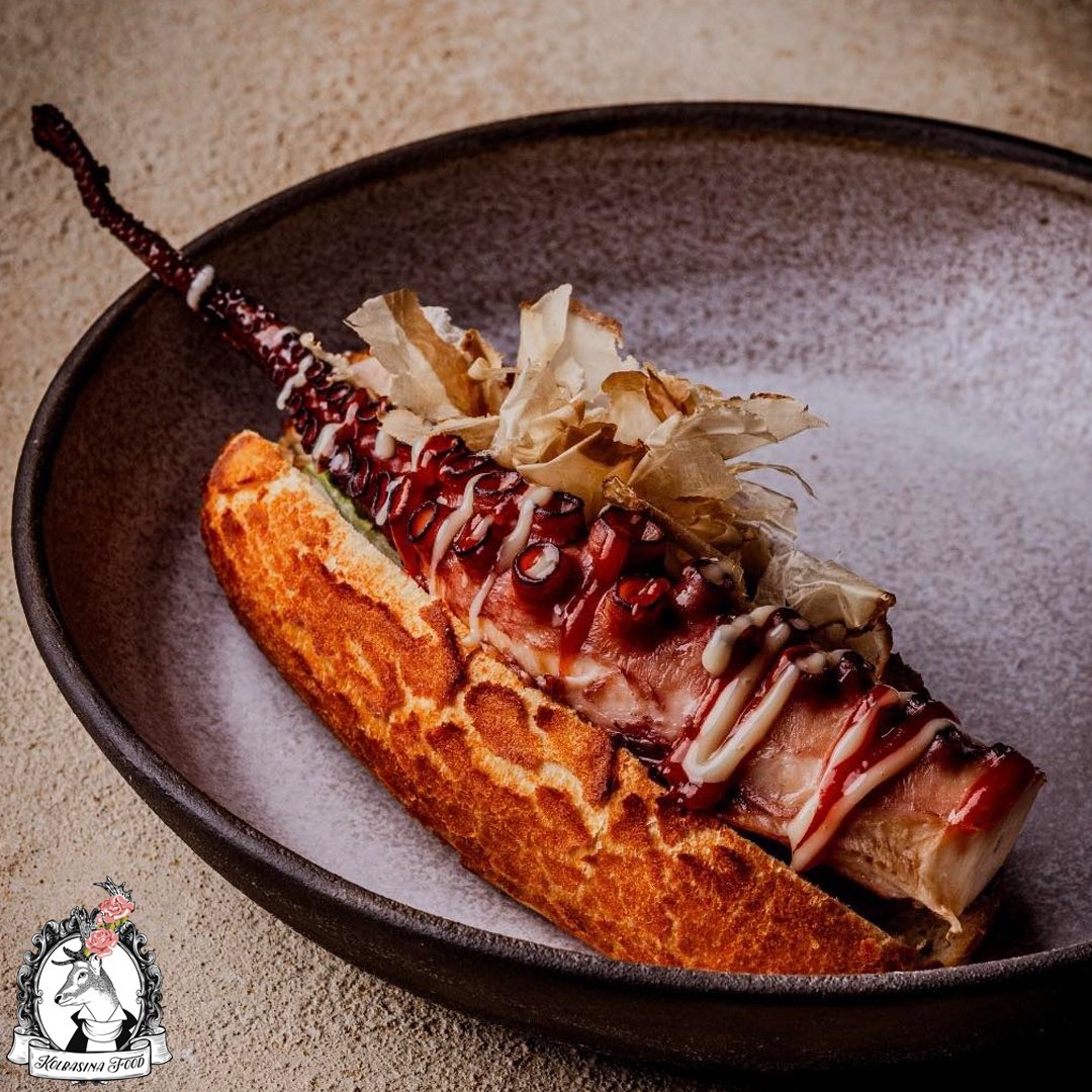 В нем всё построено на контрастах: нежное, сочное щупальце осьминога с копченым вкусом в глазури из карамельного хересного уксуса занимает место привычной сосиски. Мягкая булочка пропитана сладко-пряным кетчупом из запеченного перца и бархатным чесночным майонезом на основе печеного чеснока. Для свежести и текстуры - четвертинка мини-салата ромэн, слегка приправленного хересным уксусом и оливковым маслом. Сбалансированный, яркий, с легким морским акцентом - этот хот-дог точно ломает стереотипы и подает привычный стритфуд в совершенно новом, морском греческом исполнении.