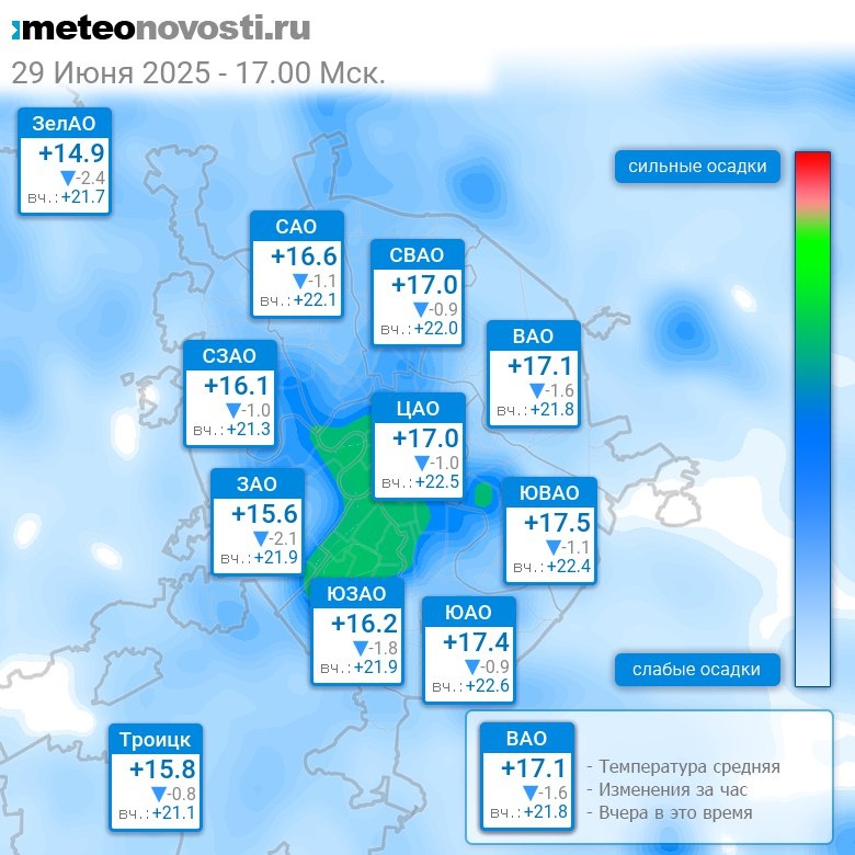 В 17:00 в Москве было от +14.5°C до +18.1°C, средняя температура +16.5°C #погода #Москва #лето #температура #29июня #воскресенье