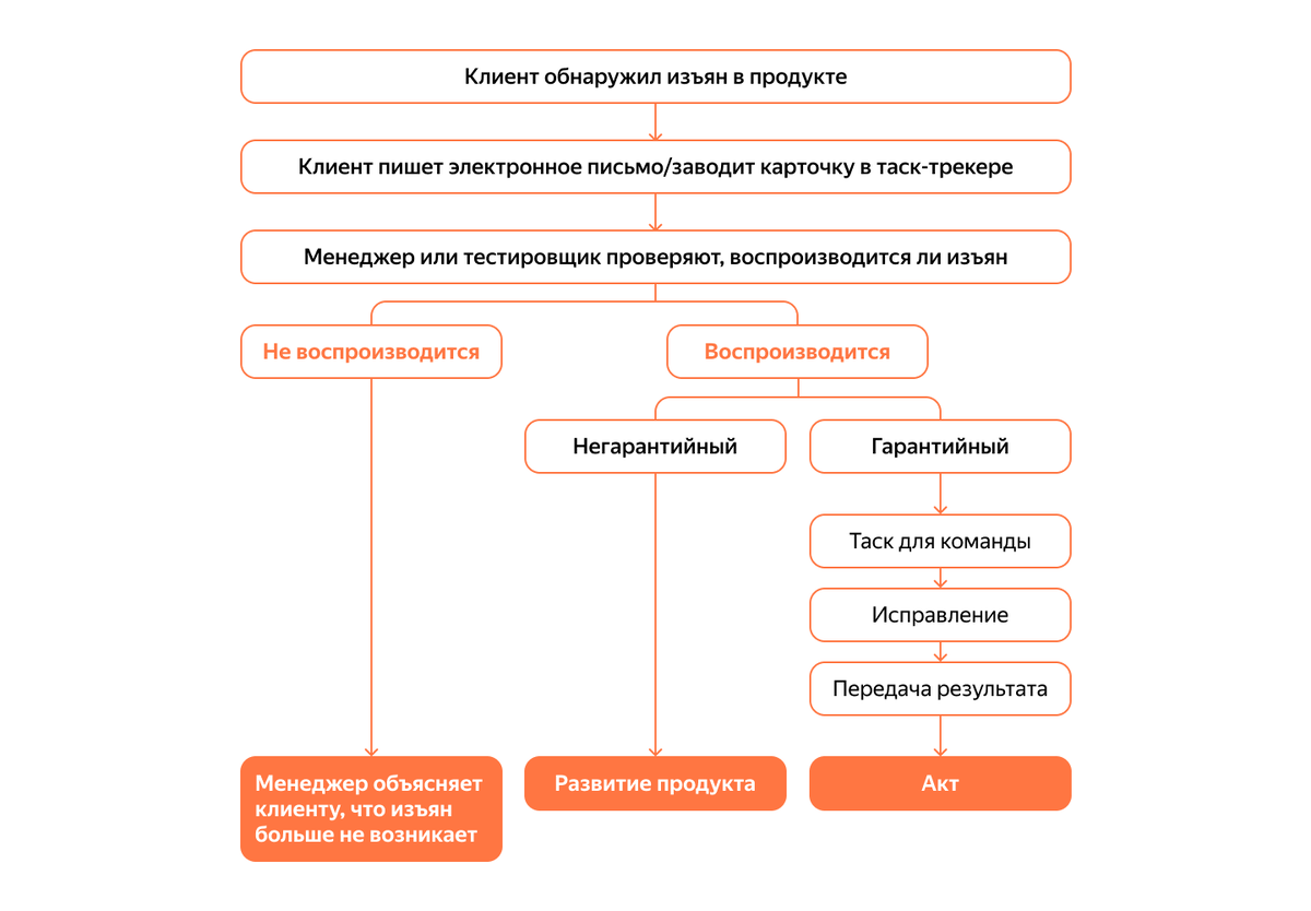 ✅ Полной оплаты по договору Сроки гарантии: Изъян — любой дефект, о котором сообщил клиент. Важно понимать, что не все изъяны являются гарантийными случаями. Тип изъяна - Пример - Гарантийный случай? Блокирующий - Система не запускается - Да Критический - Важная функция не работает - Да Незначительный - Опечатка в интерфейсе - Нет (по договору) Запрос на изменение - Хочу новую кнопку - Нет Каналы обращения: Что фиксируем: Проверяем: Негарантийные случаи: