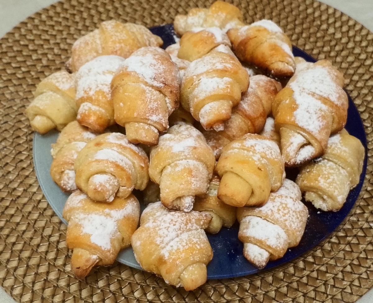 Рогалики в меру сладкие и очень вкусные. Тесто у них получается очень нежное, мягкое , рассыпчатое, начинку можно любую джем, мармелад, орехи, в моём случае просто сахар. Сметана - 150 мл Творог - 150 гр яйца - 3 шт Кефир - 100 мл Сахар - 4 ст. л Щепотка соли Разрыхлитель - 11 гр Муки - 3 стакана ( примерно + - ) Ванилин пакетик Взбейте яйца с сахаром и солью до образования пенки. В другой миске кефир, творог, сметану хорошо перемешайте. Объединить с яичной массой. Хорошо перемешать. И постепенно добавить муку с разрыхлителем и ванилином. Вымесить тесто до однородности. Тесто получается мягкое и эластичное. Долго вымешивать не нужно, и дать ему отдохнуть минут 20. Тесто разделить на две части. Одну часть теста раскатать круг. Круг посыпать сахаром, можно любое варенье место сахара. Нарезать на несколько частей как пиццу. Скручиваем рогалики. Выложить рогалики на противень застеленный пергаментом и смазать желтком. Выпекать рогалики при температуре 160 градусов 20 минут до го