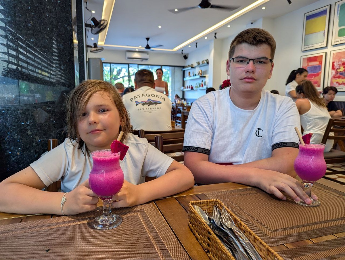 Кафе. Вьетнам. 29.06.2025. Перед тем как ехать во Вьетнам, мы почитали и посмотрели, что бы такого попробовать. Очень нахваливали яичный вьетнамский кофе. Сам кофе хороший, не дне сгущёнка, а сверху нежнейшая пенка, похожая на тирамису. Очень-очень вкусно! 😋 Взяли разные блюда на пробу, друг с другом поделились. Дети заказали себе смузи из Драгон фрута. Очень красиво выглядит, на вкус как молодой горох. Но очень необычно и интересно! Чтобы понять цены в рублях, надо откинуть три нуля и умножить на 3. т.е. 100 000 местных это 300 рублей примерно российских. Меню на русском языке. Подача довольно быстрая. Но все приносят по готовности, поэтому, кто-то уже наелся, а кому-то ещё ничего не принесли. А так как мы делились друг с другом, то все потихоньку наелись. На 4х человек полноценный обед вышел 3000 рублей с учётом десертов и морепродуктов.