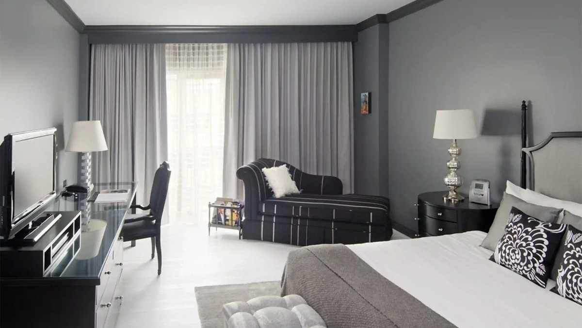 - Темно-серые обои: подойдут светлые шторы — белые, молочные, жемчужные.