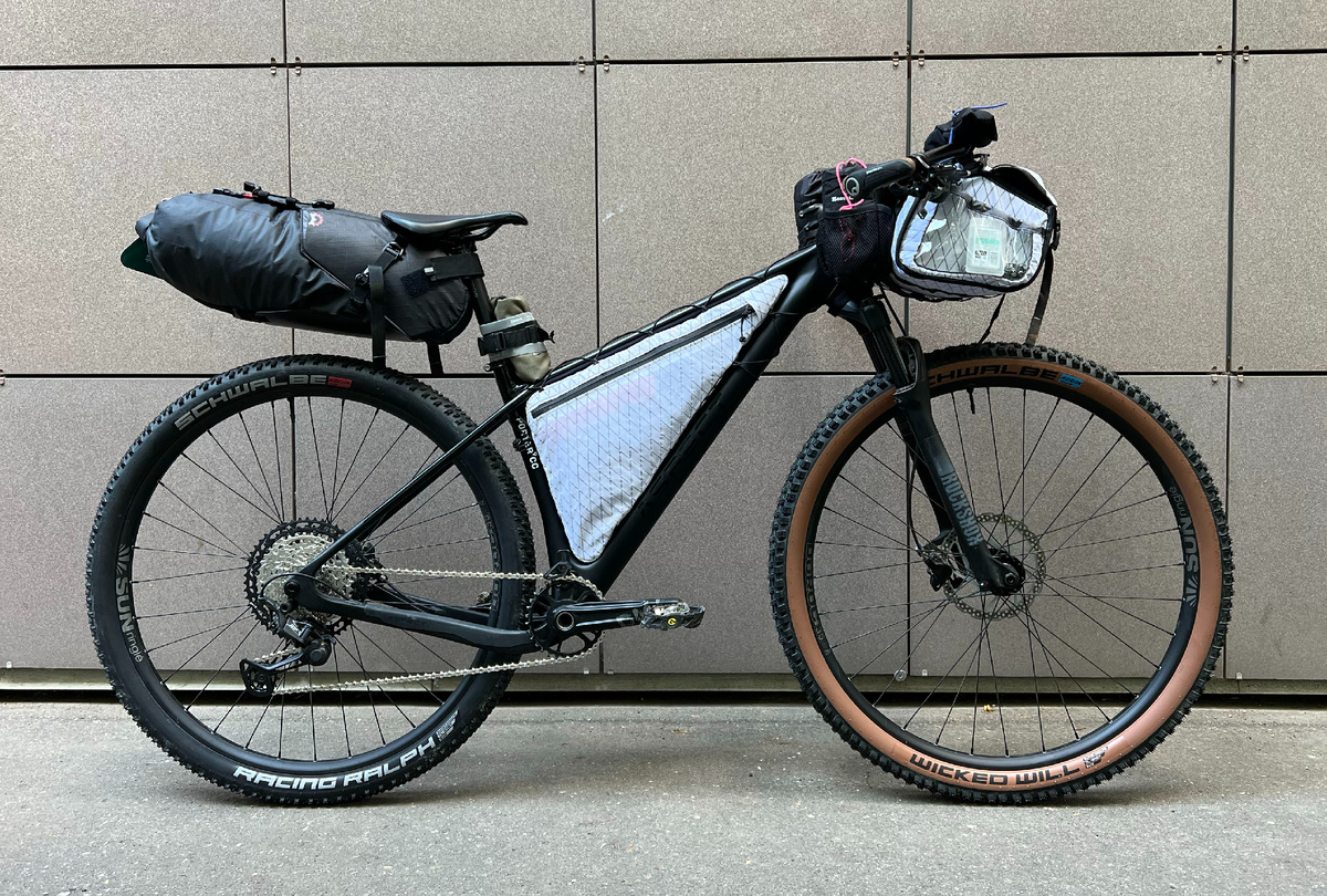 СУМКИ: внутрирамная сшита на заказ Madi bag; нарульная Apidura Backountry Handlebar Pack 11L, с ней же Accessory Pocket 4L, подседельная сумка Apudura Expedition 14L и бензобак Apidura Racing Long Tube Pack 2L. Две бутылки Fidlock, один термос либо бутылка для воды под рамой и гидратор на 2 литра в рюкзаке.