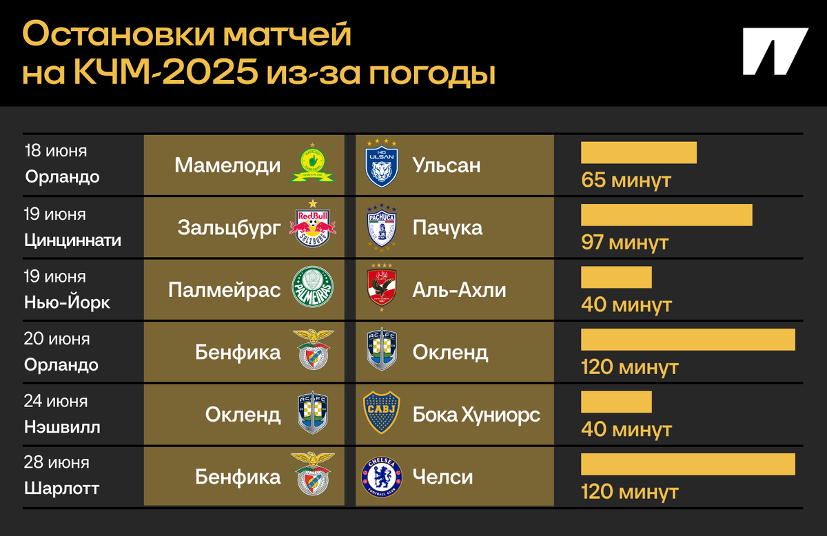 Затронуло «Челси», дважды «Бенфику» и еще 8 команд. Клубный чемпионат мира воспринимается ФИФА еще и как репетиция перед ЧМ сборных, большую часть которого следующим летом примет США. И внезапно одной из главных проблем турнира стали постоянные остановки матчей из-за непогоды. Уже затронуло шесть игр, некоторым командам досталось дважды. Представили, если такая картина повторится на ЧМ-2026? В США строгий запрет на мероприятия во время грозы – вопрос безопасности игроков и зрителей, меры работают даже на школьных турнирах. Уводят заранее, возвращают только через полчаса после последних проявлений. По местному регламенту каждый новый удар молнии в радиусе 15 км от стадиона обнуляет счетчик до возобновления, начинаются новые 30 минут. ФИФА пока ничего не может сделать, даже если хочет с таким бороться. ● Больше всех не повезло «Бенфике»: две остановки с рекордными двухчасовыми паузами. Неделю назад матч португальцев с «Окленд Сити» (1:0 – до паузы, 6:0 – после) прервали из-за грома и мол