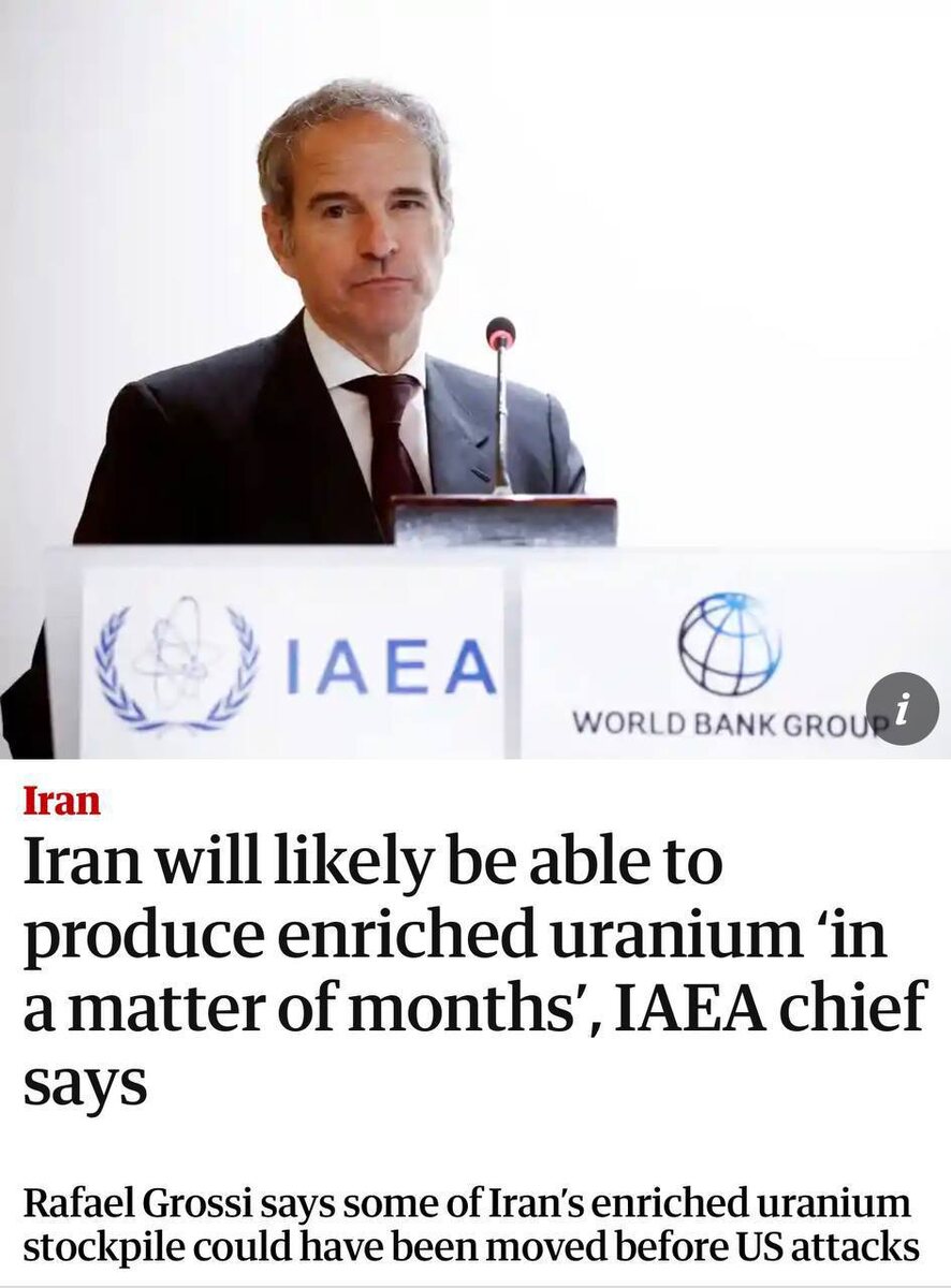 В ответ на пост 💬 Иран может восстановить ядерную программу в течение нескольких месяцев, заявил глава МАГАТЭ Рафаэль Гросси. Генеральный директор Международного агенства по атомной энергии Рафаэль Гросси заявил, что Иран способен в течение нескольких месяцев возобновить обогащение урана, несмотря на ущерб, нанесённый нескольким ядерным объектам в результате атак США и Израиля. По его словам, у Ирана всё ещё остаются ядерные мощности и запуск нескольких каскадов центрифуг для производства обогащённого урана возможен в кратчайшие сроки. "Был нанесён серьёзный ущерб, но это не тотальный ущерб. У Ирана есть промышленные и технологические мощности. Так что, если они захотят, они смогут начать делать это снова", – подчеркнул Гросси. Ключевой вопрос заключается в том, где сейчас находится 406,8 килограммов высокообогащённого урана (до 60%), которым располагал Иран до начала боевых действий, и успел ли он переместить эти запасы. Местонахождение этого материала пока неизвестно. Иронично,