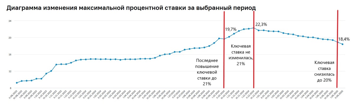 Как вы знаете, в начале июня Банк России впервые за несколько лет снизил ключевую ставку с 21 до 20% годовых, то есть, на 1 процентный пункт. С момента ее последнего повышения прошло около 8 месяцев (повышена она была в конце октября).