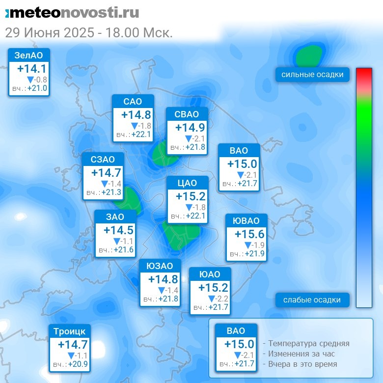 В 18:00 в Москве было от +13.6°C до +15.8°C, средняя температура +14.9°C #погода #Москва #лето #температура #29июня #воскресенье