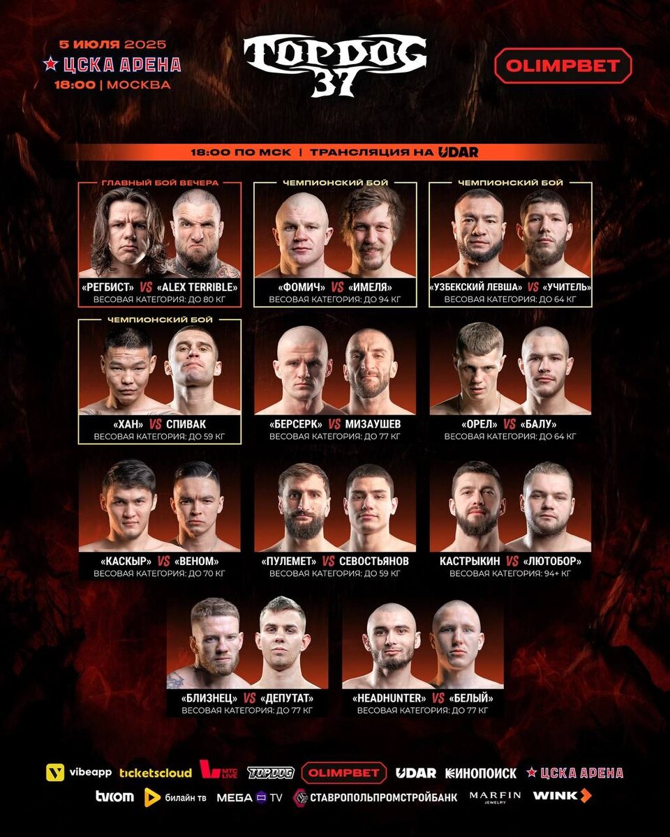 Кард турнира TOP DOG 37: Регбист vs Alex Terrible 5 июля! Начало прямого эфира в 18:00 по Москве! Где смотреть ❓⬇ Видеосервис Wink - wink.ru/tv/udar Кинопоиск - hd.kinopoisk.ru/channels?c...... Билайн ТВ - beeline.tv/ НТВ-ПЛЮС | Онлайн-ТВ - ntvplus.tv/channel/udar-681 🇺🇿 Телеканал UDAR в Узбекистане TelecomTV - telecomtv.uz 🇧🇾 Телеканал UDAR в Республике Беларусь KOT TV - www.kottv.by/ 🇧🇾 Телеканал UDAR в Республике Беларусь T1-Групп - t1group.by/ 🇰🇿 Телеканал UDAR в Казахстане - Кинопоиск подписка Яндекс Плюс - раздел спорт hd.kinopoisk.ru/sport/ 🇰🇿 Телеканал UDAR в Казахстане Alma TV- www.almatv.kz/tarify/ 🇰🇬 Телеканал UDAR в Киргизии MEGA TV - megacomtv.kg/ 🇰🇬 Телеканал UDAR в Киргизии O! TV - otv.kg/channel/64... 🇦🇲 Телеканал UDAR в Армении - wink.am/tv