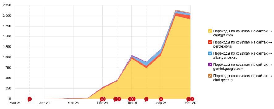 Вот так выглядит на одном из наших крупных проектов статистика переходов из нейросетей. Констатируем факт: с каждым месяцем трафик из нейронок все больше, а значит методики продвижения сайтов меняются и подстраиваются под АИ.