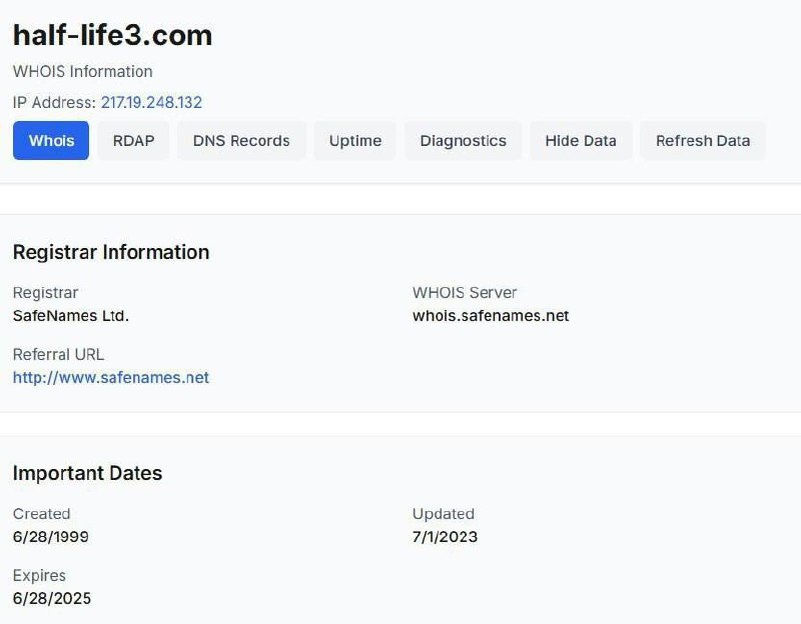 Домен half-life3.Com продлили на еще 1 год
