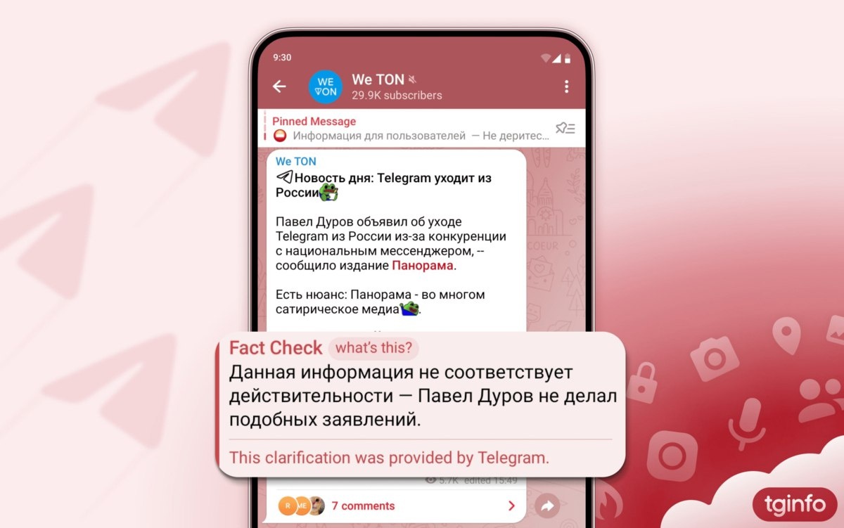 В Telegram заметили пометку с «проверкой фактов» под публикациями о том, что «Павел Дуров объявил об уходе Telegram из России из-за конкуренции с национальным мессенджером». Официально мессенджер не сообщал о запуске фактчекинга. О том, что подобную функцию разрабатывают, СМИ писали ещё весной 2024 года vc.ru/telegram/2070433