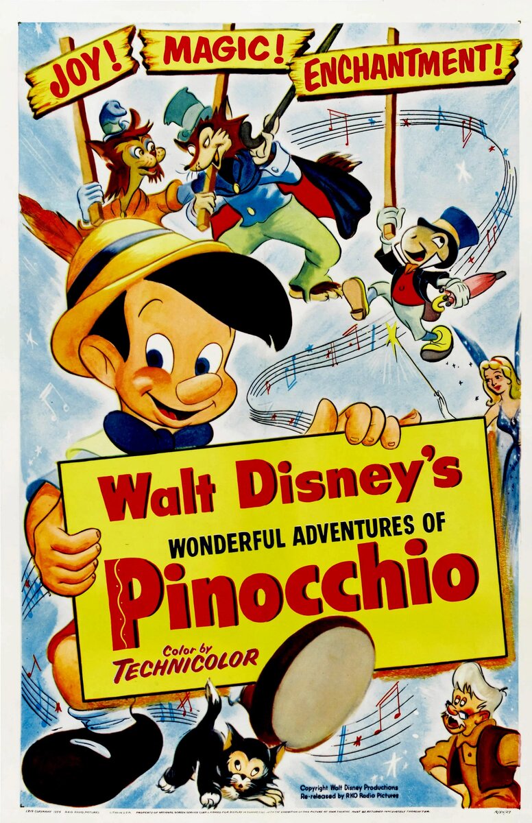 После первой принцессы Disney идёт первая деревянная кукла. "Пиноккио" мне ещё в детстве не нравился - меня он пугал своими приключениями, особенно ослами. Я очень этого боялась, и в этот пересмотр легче мне стало. А вот деревянным мальчиком я прониклась только больше. Сюжет: старый столяр Джепетто живёт с котом Фигаро и золотой рыбкой Клео. Он смастерил себе деревянную куклу, и загадал желание, что та ожила. Голубая фея услышала, и вот Пиноккио может ходить без верёвочек. Но он всё ещё не настоящий мальчик, к образу которого Пиноккио теперь стремиться. А помогает ему в этом сверчок Джимини. Эту историю знают все - почти-мальчик попадает в передряги, а потом из них как-то выбирается. Но я хочу это слегка проанализировать - Пиноккио трижды попадает в проблемы. В первый раз его спасает Голубая фея - ни почти-мальчик, ни Джимини не справились. Во второй раз Джимини, то бишь совесть, которой стало не по себе на ужасающем острове, глядя, как другие превращаются в ослов. А в последний раз он