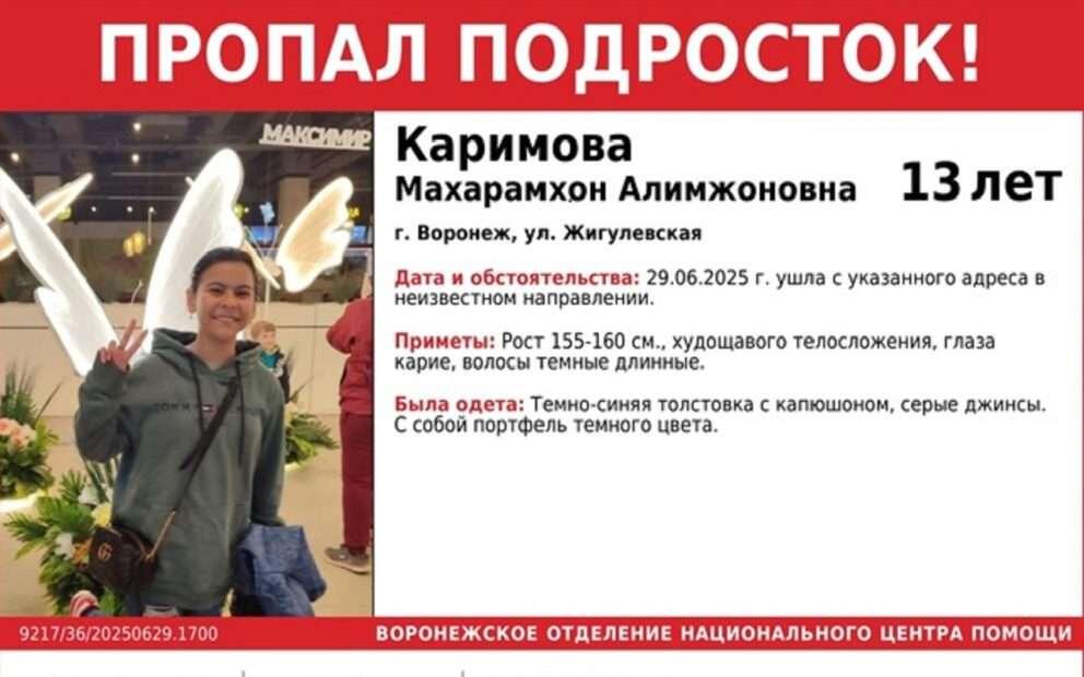 Воронежские волонтеры объявили срочные поиски 13-летней Махарамхон Каримовой, которой пропала сегодня, 29 июня. Соответствующую ориентировку опубликовали активисты регионального отделения национального центра помощи детям.
