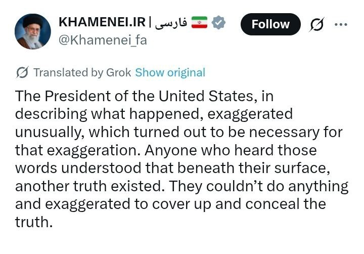 Khamenei says Trump 'exaggerated unusually' to 'cover up truth'