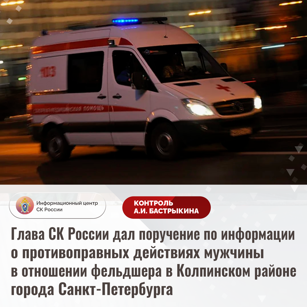 Глава СК России дал поручение по информации о противоправных действиях мужчины в отношении фельдшера в Колпинском районе города Санкт-Петербурга В СМИ сообщается, что 26 июня текущего года в Колпинском районе города Санкт-Петербурга местный житель избил фельдшера бригады скорой медицинской помощи, прибывшего на вызов к супруге фигуранта. У пострадавшего диагностированы телесные повреждения. ГСУ СК России по городу Санкт-Петербургу инициировало вопрос передачи возбужденного по данному факту уголовного дела из органов внутренних дел в свое производство. Председатель Следственного комитета Российской Федерации Александр Иванович Бастрыкин поручил руководителю ГСУ СК России по городу Санкт-Петербургу Павлу Сергеевичу Выменцу доложить о результатах рассмотрения обращения о передаче возбужденного уголовного дела из органов внутренних дел в производство подчиненных следователей. Исполнение поручения поставлено на контроль в центральном аппарате ведомства. #СледственныйКомитет #СКРоссии #СКР #