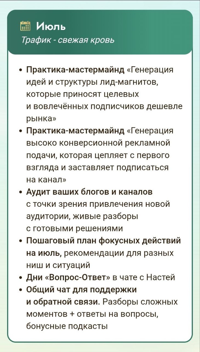 Смотрю на программу клуба и в огромном предвкушении, как мы с вами будем в июле и августе всё реализовывать 🔥 Тема июля - "Трафик - свежая кровь" Тема августа - "Стратегия 2025-2026" Внутри каждого месяца - тематические практики, мастермайнды, стратсессии, задания, челленджи, аудиты и разборы. Не исключено, кстати, что это не финальная версия, и я в момент вдохновения ещё чего-нибудь добавлю - я такая И да, как я уже говорила, доступ к контенту июня на тему "Продуктовый апдейт" получат все, кто сейчас присоединится к нам. ——— Очень люблю наши недорогие форматы, вот честно. За то, что их могут себе позволить абсолютно все. Это правда доступные продукты. За то, что при небольшой стоимости эффект от внедрения кратно превышает цену. Потому что чёткая методология, структура, системный подход. Так и здесь: готовые решения, собранные по проверенной логике. Не надо придумывать пятое колесо: просто взять и повторить. Ещё и в тёплой компании единомышленников. Плюс, супер приятная цена.