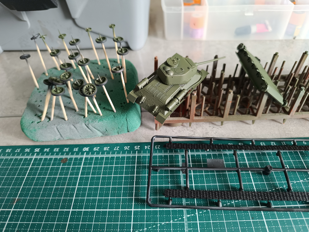 Раздельная сборка с определенного момент стала для меня стандартом. Тридцатьчетверка не стала исключением Ну-с, приступим! Сначала устанавливаю внутренние половины катков После этого можно натягивать гусеницы, предварительно рассверлив отверстия в ушах крепления и уменьшив их толщину напильником Затем устанавливаю передние части катков При окраске мелочей нужно будет подкрасить сколы, которые повились при сборке. Основание готово, можно ставить верх с башней Теперь дело за окраской мелочей)