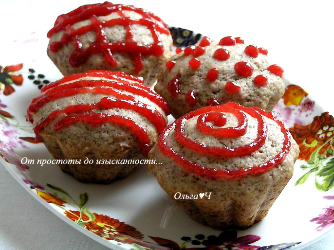 малиновый джем или повидло для украшения Приготовление: Вишню измельчите в пюре с помощью блендера, добавьте воду и сахар, перемешайте. Влейте масло, перемешайте. Всыпьте муку с разрыхлителем и ванилином. Перемешайте. Разложите тесто по 6 формочкам. Выпекайте при 180*С 25-30 минут. Остудите, украсьте джемом по вкусу и подавайте. Приятного аппетита! Вам также могут понравиться: