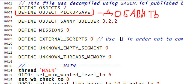 точка сохранения - это типа дискетка которая есть в доме Сиджея (Карла Джонсона), встав на которую можно сохраниться. Скрипт будем создавать в MAIN.SCM - для его открытия понадобится Sanny Builder Начнем с того, что нам надо определить модель дискеты из архивов. Добавьте строчку "DEFINE OBJECT PICKUPSAVE" В моем случае очищенная ГТА СА, если вы захотели добавить точку сохранения в оригинал то вам этот пункт не нужен (это уже ввели за вас). нужно создать отдельный поток под алгоритм сохранения: