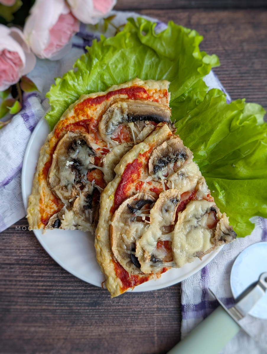 Смазываем её 30 г. томатной пасты, выкладываем ломтики грибов и посыпаем сверху сыром.