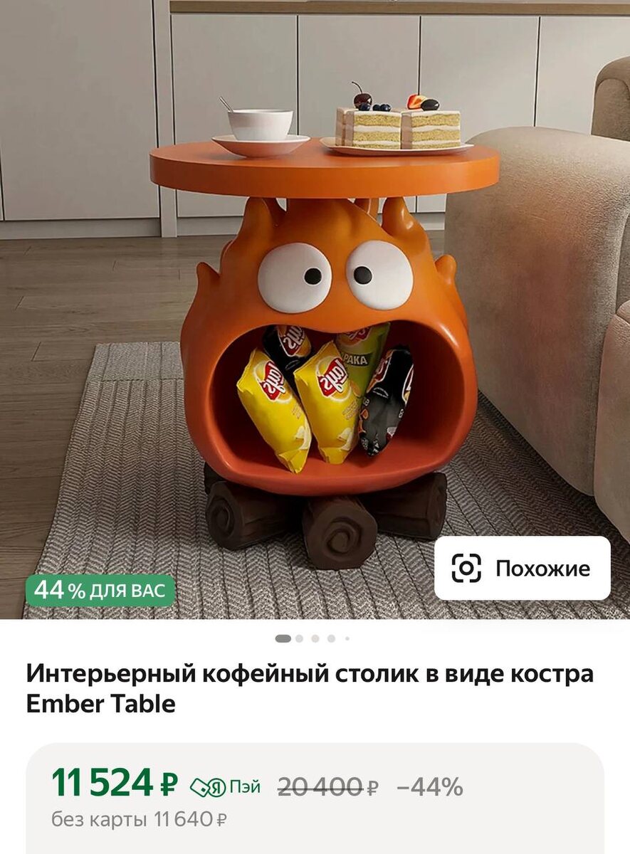 Стол в виде Кальцифера продается на маркетплейсах! Забавный предмет интерьера повторяет испуганное выражение лица персонажа Миядзаки. Стоимость — 11,5 тысяч рублей.