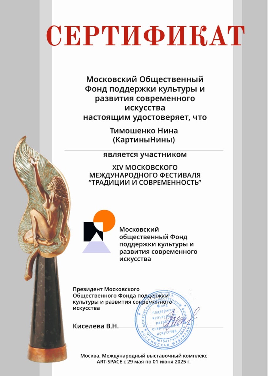 Сертификат, краски и немного сказки Прошло время, улеглись страсти… Я уж и забыла про фестиваль «Традиции и современность», как вдруг — хоп! — сертификат участника прилетел. Теперь вот сижу, смотрю на него и улыбаюсь. Добавила фото — ну чтоб не думали, что я всё это выдумала из-за жажды признания 😄 На фестиваль я привезла свои работы в стиле наивного искусства. Простые, как пирог по бабушкиному рецепту, но в каждой — мой внутренний мир, немного цвета, немного сказки и целая гора души. Иногда кажется: ну что там — краски, кисти, бумажка с печатью… А потом смотришь — и понимаешь: каждая такая «бумажка» — это веха. Маленькое «да» на большом пути. Наивное искусство — это не про «просто», это про «по-настоящему». И я рада, что у меня есть возможность быть частью этого мира. Пусть и не с триумфами, но точно — с любовью. #наив #абстракция #уютвкрасках #настроение #тёплаяживопись #картиныНины