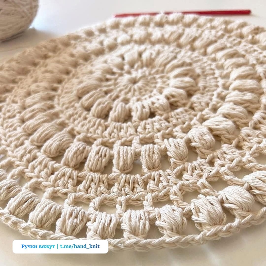 Круглая салфетка или основа под коврик, связанная крючком по плотной схеме с использованием выпуклых "пышных столбиков" (popcorn stitch). Такой мотив можно использовать как: - салфетку; - настенное панно; - элемент для сумки; - или даже основу для круглого коврика, если продолжить ряды. #вязание • #круг