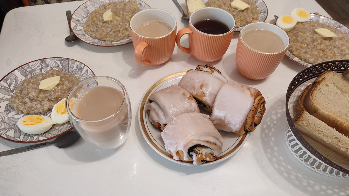 На завтрак у нас сегодня овсянка. Себе и мужу отварила по яйцу, сыну намазала масло на хлеб.