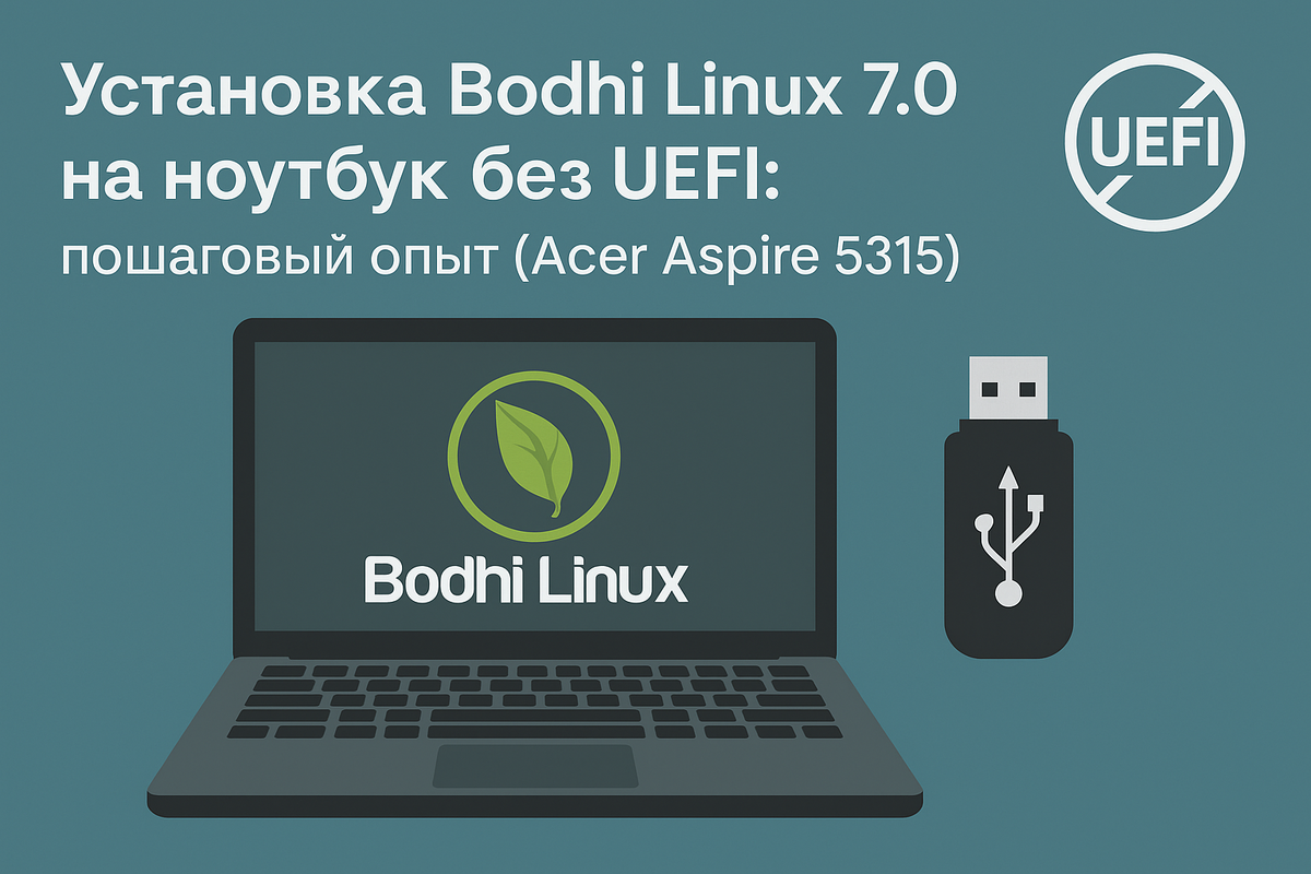 Я пытался установить Bodhi Linux 7.0 на старый ноутбук Acer Aspire 5315, у которого отсутствует поддержка UEFI — только Legacy BIOS. В процессе я столкнулся с рядом ошибок, сообщений об отсутствии EFI-раздела и проблемами с загрузкой после установки. В этом материале я делюсь полным пошаговым руководством, начиная с создания загрузочной флешки и заканчивая успешной загрузкой системы. Когда Bodhi не загрузился после первой попытки установки, я запустил Boot-Repair из live-сессии и получил предупреждение: "Current session is in BIOS-compatibility mode... Please disable BIOS-compatibility/CSM/Legacy mode..." Это сообщение не имело смысла, так как мой ноутбук не поддерживает UEFI вообще. Я подтвердил: UEFI в BIOS отсутствует, только режим Legacy. Я переформатировал флешку, используя Rufus со следующими параметрами: Также были выбраны опции: После этого флешка была готова к установке Bodhi. Я перезагрузил ноутбук и убедился, что флешка загружается в режиме Legacy, а не UEFI (так как последн