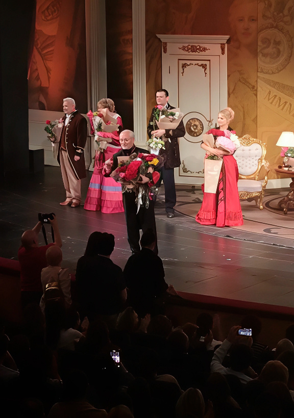 Зрителей собралось полный зал. Как выяснилось, еще накануне билеты были распроданы. А к актерам по дружбе звонили ну о-очень высокопоставленные люди и просили билетик, поделился на пресс-конференции перед премьерой спектакля народный артист России, художественный руководитель Театра сатиры Евгений Герасимов. Он, кстати, сам играет одну из центровых ролей - влиятельного чиновника и старика Аристарха Владимировича Вышневского.