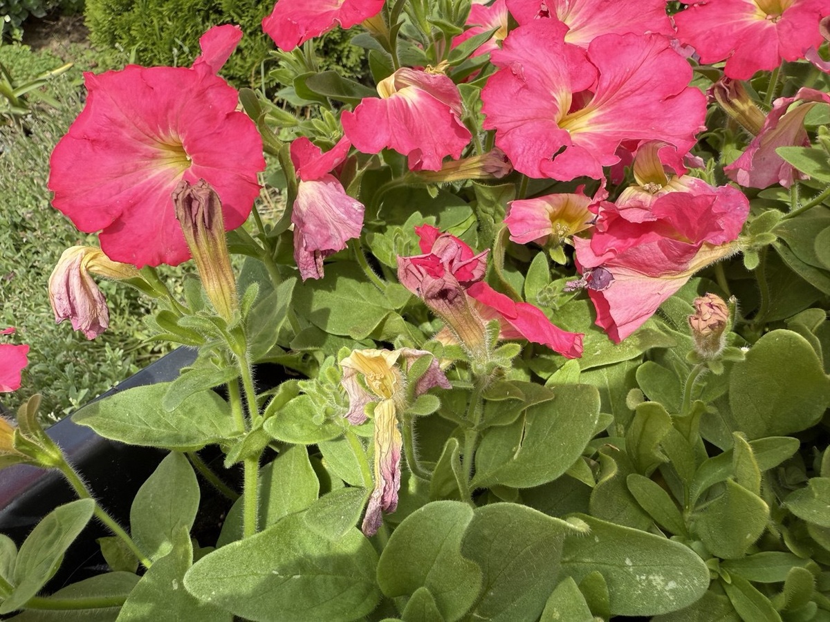 Уход за петуниями не занимает много времени и сил, если делать это ежедневно и с любовью🌸❤️. Мне же, пришлось сегодня потрудиться над своими любимицами, так как дождливая и прохладная погода в течении недели сделали своё дело🧐. Цветочки погрустнели и изрядно потрепались на ветру, потеряв свой шарм и красоту. Петунии любительницы обильного и и регулярного полива. В жаркую погоду клумбы с петуниями поливайте утром и вечером. Растения в вазонах, горшках – утром или вечером. Если целый день, термометр показывал температуру выше 25 градусов, вечером бережно оросите кустики петунии из пульверизатора. Но будьте осторожны, чтобы чтобы не повредить хрупкие цветки. Перед корневой подкормкой петунию также необходимо пролить тёплой водой — это убережёт растение от ожога корней🔥. Подкормку проводят только по влажной земле, лучше всего — через час после полива. Удобрения разводят в тёплой воде и поливают рассаду под корень, стараясь не попадать на листья, чтобы избежать ожогов. Идеальное время