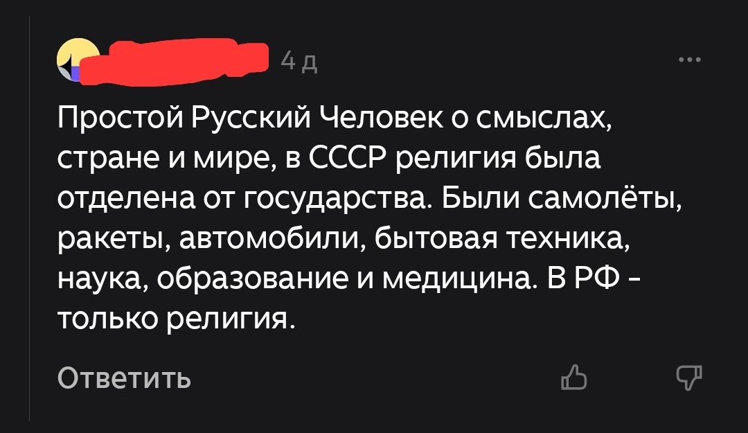 Почему нам захотелось ответить на приведенный комментарий? Потому что он симптоматичен. Даже не тем, что назвать то, что в СССР делали с религией и Церковью - "отделением от государства", это немножечко увести от реального положения дел. Скажем так, кое-что приуменьшить, а о чем-то умолчать. Это сарказм, если что. И не тем, что в РФ все это есть и где-то даже лучше. Санкции многое показали. И даже не очевидным фактом, что кое-что из перечисленного было как минимум не хуже, а может и лучше западного, кое-что откровенно хуже, а что-то просто западное. А тем, что перечисленный список - симптоматичен. Самолеты, ракеты, автомобили, бытовая техника, наука, образование, медицина. Ведь этот список - некий аргумент в пользу строя. Верно? Мы неоднократно уже указывали на этот симптом, из-за которого скорее всего СССР и распался. Советский Союз начинался как идеологический проект достижения социализма и коммунизма. Но в этом списке о них не слова. С одной стороны, как будто все правильно, Маркс